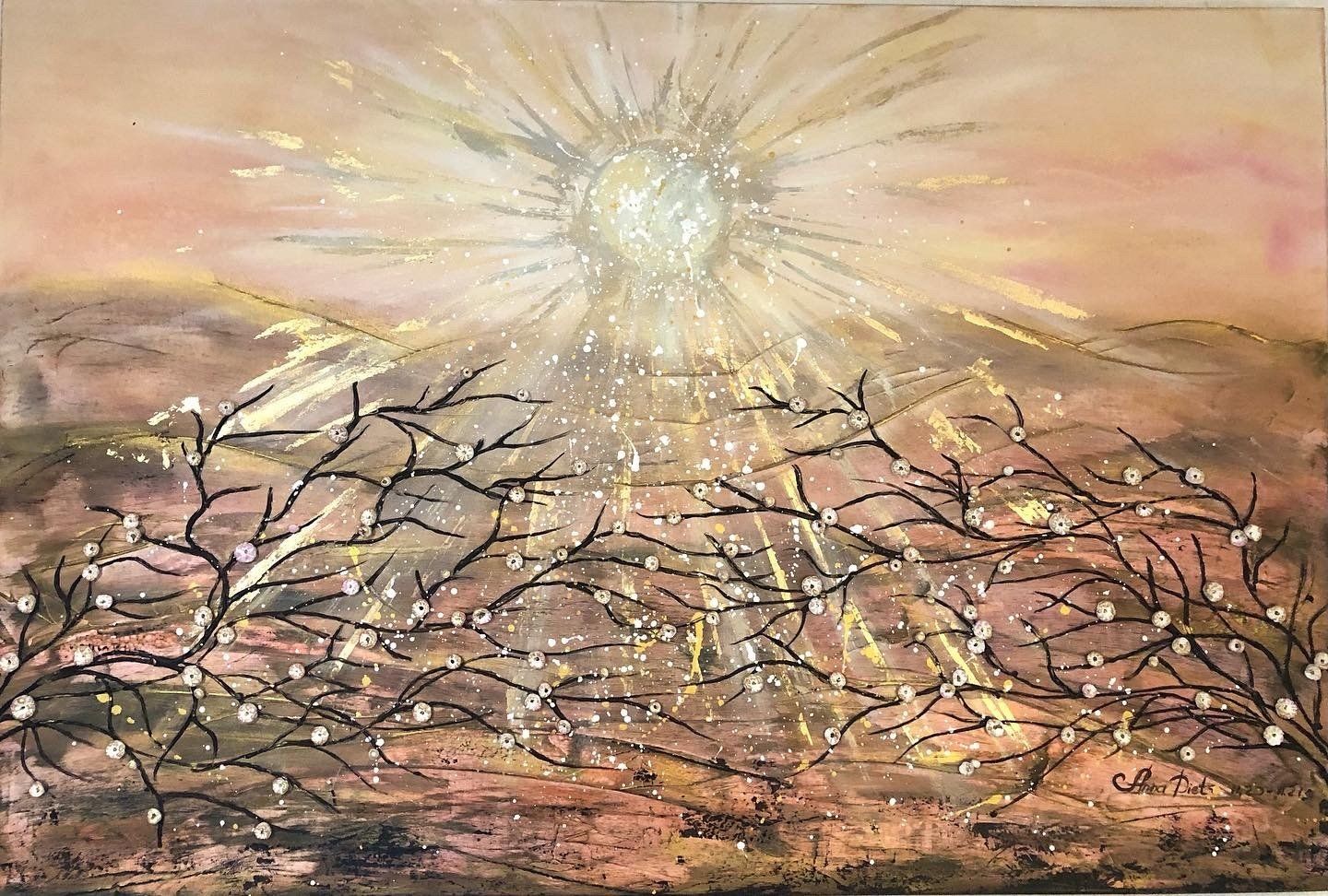 Ich male aus der Seele heraus und verwende dafür verschiedene Materialien (z.B. Pastell, Bleistift, Stifte, Aquarell- und Oelfarben, Modeliermasse, Edelsteine, Gold). Die Bilder sind oft plastisch und sehen je nach Beleuchtung (Tageslicht, Sonnenstrahlen, künstliches Licht) verschieden aus.